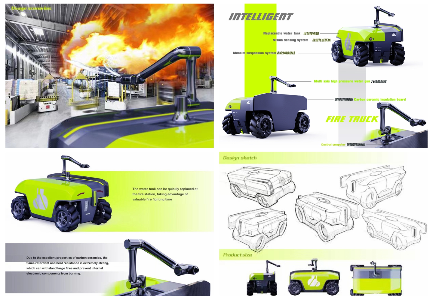 《智能无人消防车》是为应对未来智能工厂生产制造进行的概念设计。消防车与智能工厂的消防系统进行互联,可在无人环境下进行灭火,有效降低消防人员面临的未知危险。面对无人化时代的加速到来,本设计围绕着“工业4.0、智能制造、应急救援”三大设计关键词,诠释了“设计让生活更美好”的设计目标,用高度集成、人工智能、极具生命力的创新技术理念,赋予该设计鲜活的生命力,同时呼应人道、博爱的产品属性,传递出设计为人服务的设计态度。