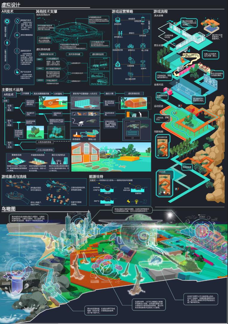 《Talk to virtuality》作品选址青岛市燕儿岛公园。当代城市公共空间多面临着建造成本高、设计更新慢、缺少体验感等问题,从而导致使用率低且缺乏活力。同时,随着信息技术的提高,年轻人多倾向宅于室内使用手机等电子产品,缺乏户外活动。获奖方案将AR(增强现实)等科技手段运用到城市设计中,通过此方式吸引“电子依赖症”患者走出家门、亲近自然,同时赋予城市公共空间新的理念与功能。