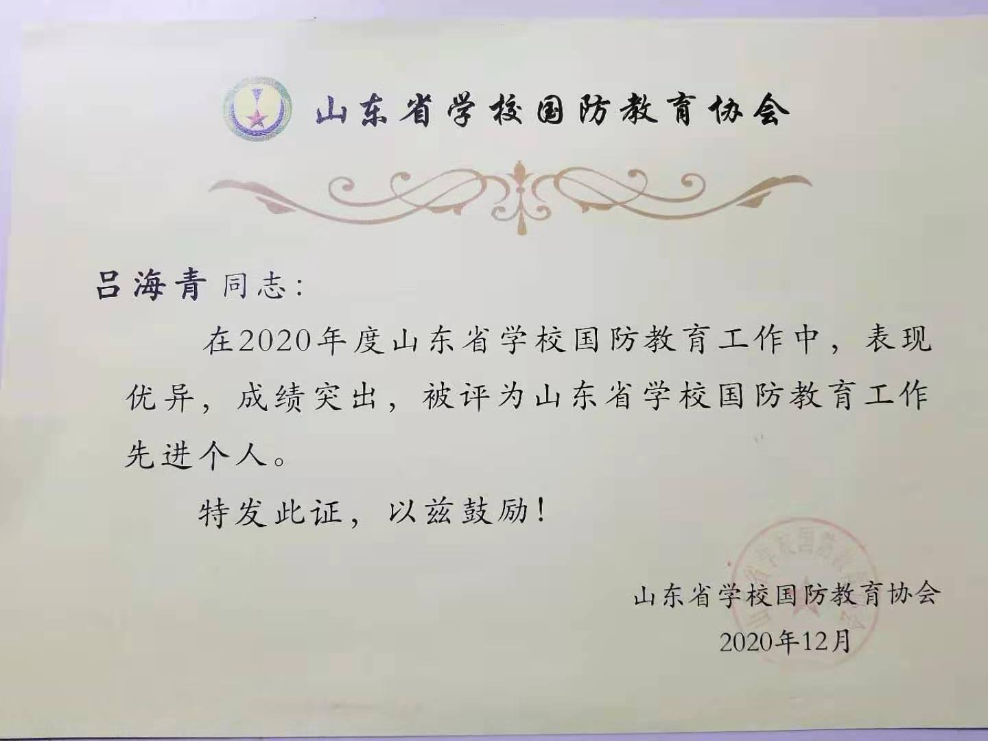 经各高校推荐,山东省学校国防教育协会评定,365完美王栋栋、吕海青同志被评为“山东省学校国防教育工作先进个人”。