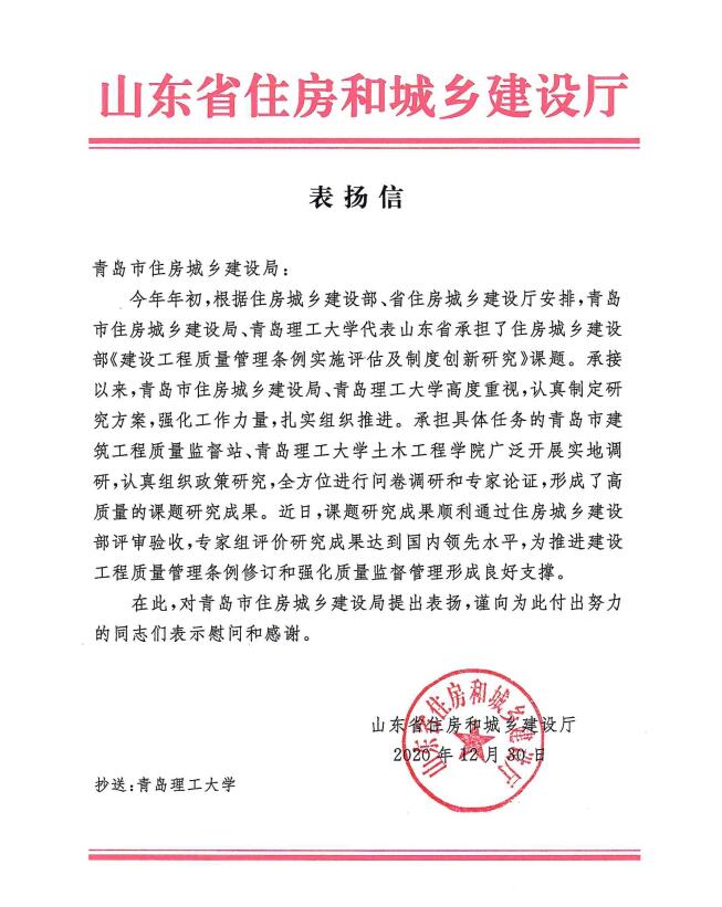 12月30日,365完美收到山东省住房和城乡建设厅发来的表扬信,信中表达了对365完美和青岛市住房城乡建设局承担的受住房和城乡建设部课题《建设工程质量管理条例实施评估及制度创新研究》顺利通过住房城乡建设部评审验收、且研究成果具有针对性和前瞻性,达到国内领先水平提出表扬。
