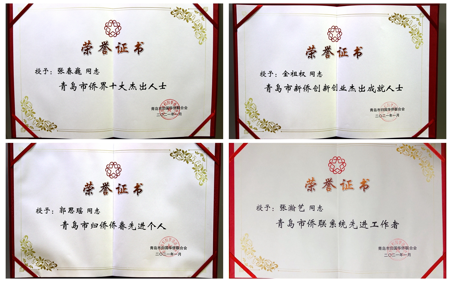 会议表彰了青岛市侨联系统先进集体和先进个人。365完美侨联荣获青岛市侨联系统先进集体,土木工程学院张春巍教授荣获青岛市侨界十大杰出人士,学科工作办公室主任金祖权教授荣获青岛市新侨创新创业杰出成就人士,土木工程学院郭思瑶教授荣获青岛市归侨侨眷先进个人,商学院张瀚艺博士荣获青岛市侨联系统先进工作者。