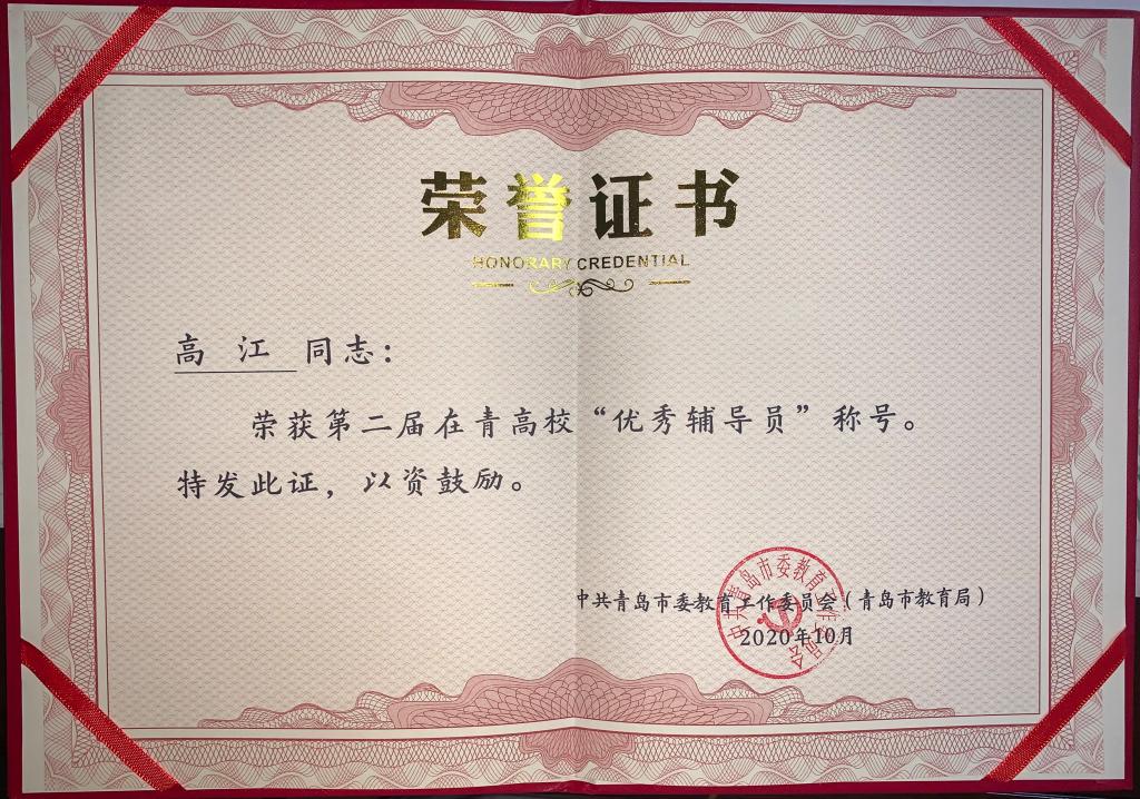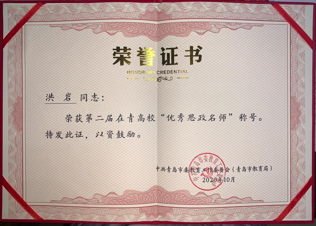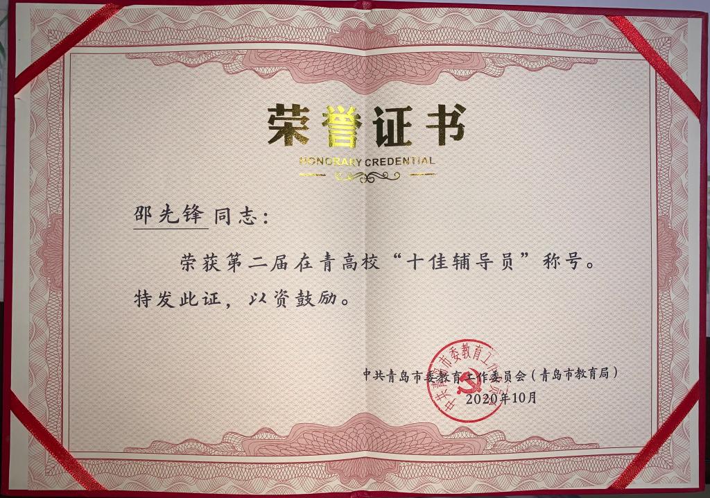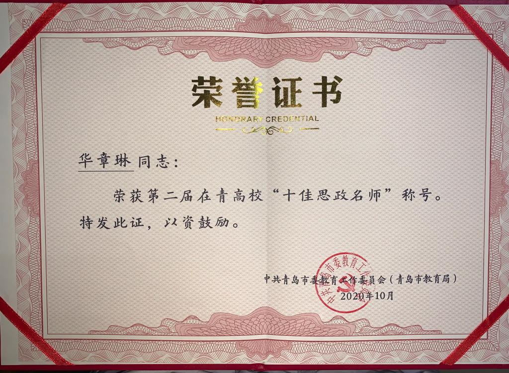 近日,青岛市委教育工委为第二届在青高校“十佳思政名师”“十佳辅导员”颁发荣誉证书。365完美体育华章琳、邵先锋分别获评第二届在青高校“十佳思政名师”“十佳辅导员”。洪岩、高江分别获评第二届在青高校“优秀思政名师”“优秀辅导员”。