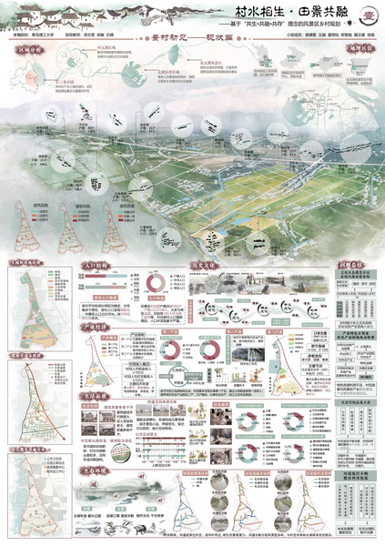 乡村规划方案竞赛单元佳作奖获奖作品《村水相生·田景共融》(作者:郭靖萱、王越、夏明怡、欧智临、戴文豪、徐瑜,指导老师:李兵营、石峰、徐敏)团队对江苏省苏州市相城区望亭镇北太湖风景区进行了前期调研,通过现状问题的总结,现有资源、元素的提取,确定了以水为媒、联水而动的规划手法,生态、生产、生活、文化融合共生的规划策略,最终达到村庄与风景区以及周边环境的融合共生。其中,在生态方面依托现有自然资源将风景区分为五大板块,充分利用村庄特色资源,构建景村共生模式和共生协调机制、补偿机制。在生产方面对现状产业结构进行梳理,形成多产业融合模式,基于村民就业需求、游客的体验需求,依托产业运营和依托,构建出完整的三产融合产业链。在生活方面通过公共活动空间的改善提升、传统文化的传承延申使得村民生活与游客体验共存,传统文化与现代旅游共存,景点设置与乡村民居共存。