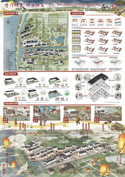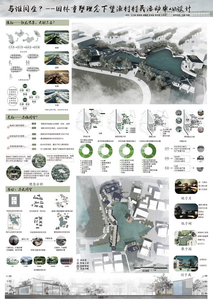 乡村设计方案竞赛单元优胜奖获奖作品《与谁同坐?》(作者:于子涵、谢婧演、曹思源、杨瀚霆、张禄通、王辰昊,指导老师:石峰、徐敏)以苏州拙政园中“与谁同坐轩”为切题点,旨在完善望渔村内基础设施,提升村民生活质量,促进望渔村生态农业与休闲旅游进一步发展。全面地展示了作品“与我同坐轩”背后的乡村思考,传达出设计小组“希望将传统苏州园林神韵与乡土元素有机融合共生,建设美丽望渔村”的美好心愿,得出“问曰与谁同坐?——明月清风我……”的心得感悟。值得一提的是,这个团队是由二年级学生组成的,闯进乡村设计单元的决赛阶段20强,最终获得了优胜奖。