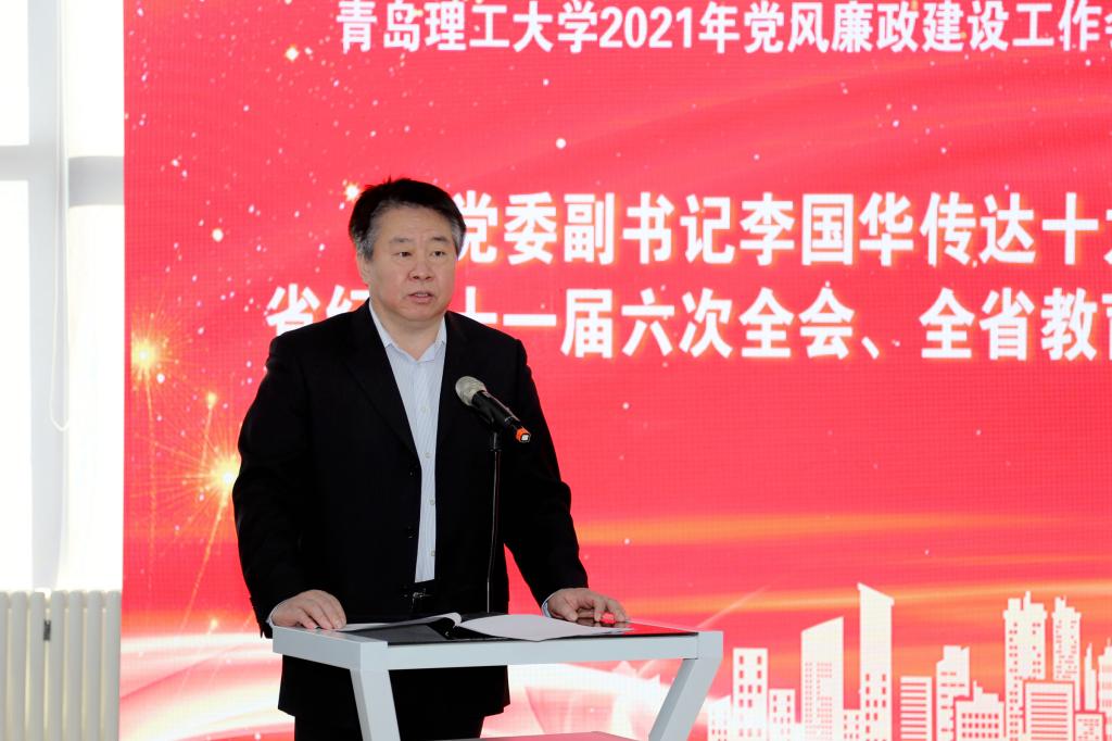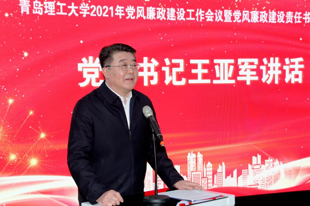 王亚军在讲话中指出,2021年是“十四五”开局之年、中国共产党成立100周年,也是学校事业发展进程中具有特殊重要性的一年,加强党的建设尤为重要,要以党风廉政建设为引领,在加强政治建设、组织建设、思想建设、作风建设、制度建设下功夫,不断提高全面从严治党实效,为推动学校内涵式高质量发展提供坚强政治保证。一是要统一思想,坚定不移增强全面从严治党的政治自觉。学校各级党组织主要负责人,必须提高政治站位,保持战略定力,聚焦主责主业,以更高的标准,更严的要求,主动担当作为,不断推动全面从严治党向纵深发展、向基层延伸。在贯彻执行学校党委工作部署、完成急难险重任务中,不断提高政治判断力、政治领悟力、政治执行力,更好担负起党和人民赋予的政治责任。二是要转变作风,坚定不移推进全面从严治党向纵深发展。要严格执行政治纪律、组织纪律、廉洁纪律、群众纪律、工作纪律、生活纪律,进一步加强作风建设,将党风、工作作风、教风、学风、师德师风建设统筹到学校各项工作当中,教育引导教职员工与学校同舟共济,把心思精力用在学校和学院事业的发展上,用实际行动践行“百折不挠、刚毅厚重、勇承重载”的理工精神。三是要真抓实干,坚定不移落实全面从严治党的各项任务。学校各级党组织要在抓落实上见真章、动真格、求实效,从严加强政治建设、从严加强思想建设、从严加强基层党组织建设、从严加强干部队伍建设、落实党风廉政建设责任、切实抓好巡视整改工作。学校纪检监察部门要完善全面从严治党的监督体系建设,构建网格化体系,不断加大对工作巡查督查的力度。各党总支(分党委)要守土有责种好“责任田”、协同履责打好“整体战”、严肃考核用好“指挥棒”,以实的举措完成好立德树人的根本任务。