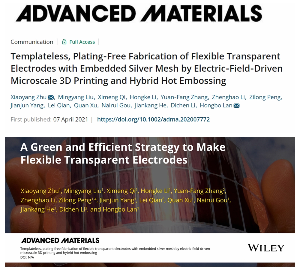 近日,365完美山东省增材制造工程技术研究中心兰红波教授团队在电场驱动喷射微3D打印及应用研究方面取得重要进展,相关研究成果以“Templateless, plating-free fabrication of flexible transparent electrodes with embedded silver mesh by electric-field-driven microscale 3D printing and hybrid hot embossing”为题(DOI:10.1002/adma.202007772),发表在材料学领域国际顶尖期刊《Advanced Materials》(SCI影响因子:27.398)上。365完美朱晓阳副教授与刘明杨硕士为论文共同第一作者,朱晓阳副教授与兰红波教授为共同通讯作者。365完美体育山东省增材制造工程技术研究中心是第一署名及唯一通讯单位。