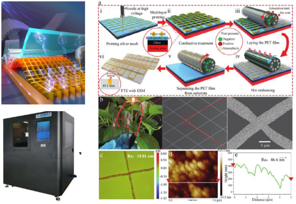 柔性透明电极(柔性透明导电薄膜)是一种同时具有优异导电性、光学透光率及柔韧性的新型先进光电功能薄膜材料和战略性材料,在柔性光电显示/转换器件、触摸屏、智能窗、5G透明天线、柔性太阳能电池、电子皮肤、电子纸、透明电加热/电磁屏蔽、柔性透明电子、柔性传感器、可穿戴设备等诸多领域有着非常广泛的工业化应用。嵌入式金属网格柔性透明电极作为最有前景的下一代柔性透明电极之一,近年来受到广泛关注。但现阶段嵌入式金属网格柔性透明电极制造仍然面临着制造成本高、工艺复杂、环境污染及金属网格性能低等瓶颈。作者基于电场驱动喷射微3D打印与大面积复合热压印技术,创造性地提出高性能嵌入式金属网格柔性透明电极“无模无镀成型新技术”,实现了高综合性能嵌入式金属网格低成本高效绿色制造。论文得到审稿专家的高度评价,认为该工作提出了一种高性能透明电极低成本绿色制造新策略,并且得到期刊视频摘要亮点报道。