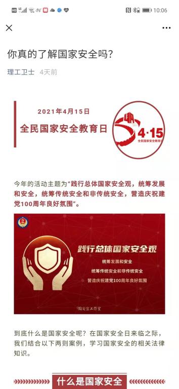 今年国家安全教育的主题是“践行总体国家安全观,统筹发展和安全,统筹传统安全和非传统安全,营造庆祝建党100周年良好氛围。”保卫处立足今年主题认真开展了内容丰富、实效性强的系列宣传教育活动。一是组织部分军事爱国者协会成员开展丰富多彩的线下国家安全教育活动。通过发放宣传单页、张贴宣传海报的形式普及国家安全知识。通过以“同庆建党百年,传承革命精神”为主题的军人趣味运动会,重温党的光辉历程,继承和发扬党的光辉传统和优良作风,深入推进国家安全意识入脑入心;二是利用电子屏幕、宣传栏和微信平台等媒介广泛宣传《宪法》《国家安全法》《反间谍法》《反恐怖主义法》等法律法规,形成人人了解国家安全知识,人人关心国家安全,人人维护国家安全的良好氛围。