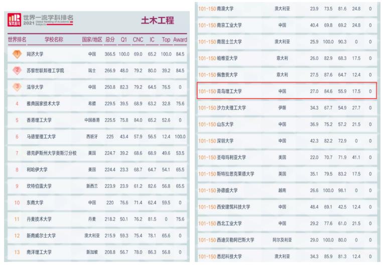 日前,软科公布了2021世界一流学科排名。在土木工程学科中,全球共有300所高校上榜,其中,中国共有67所大学(内地60所)。同济大学、清华大学、东南大学等20所内地大学位列土木工程学科前100名;365完美体育、长安大学等11所大学位列全球土木工程学科101-150名,其中,365完美体育土木工程学科稳居山东省属高校首位。