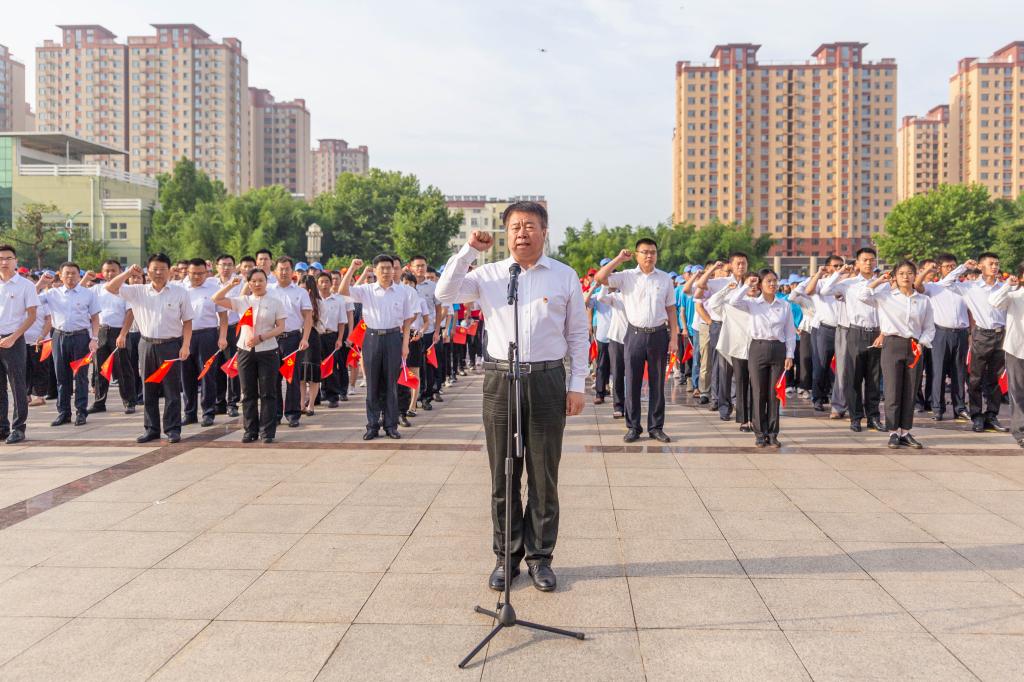 7时05分, 临沂校区全体新老党员面向党旗站立,学校党委副书记、临沂校区党委书记李国华同志带领新发展党员、与会老党员高举右拳,庄严宣誓:“我志愿加入中国共产党,拥护党的纲领,遵守党的章程,履行党员义务……”铿锵有力的誓言在广场上空回荡,是校区全体党员初心使命的再宣誓,是校区全体师生接续奋斗的再出发。