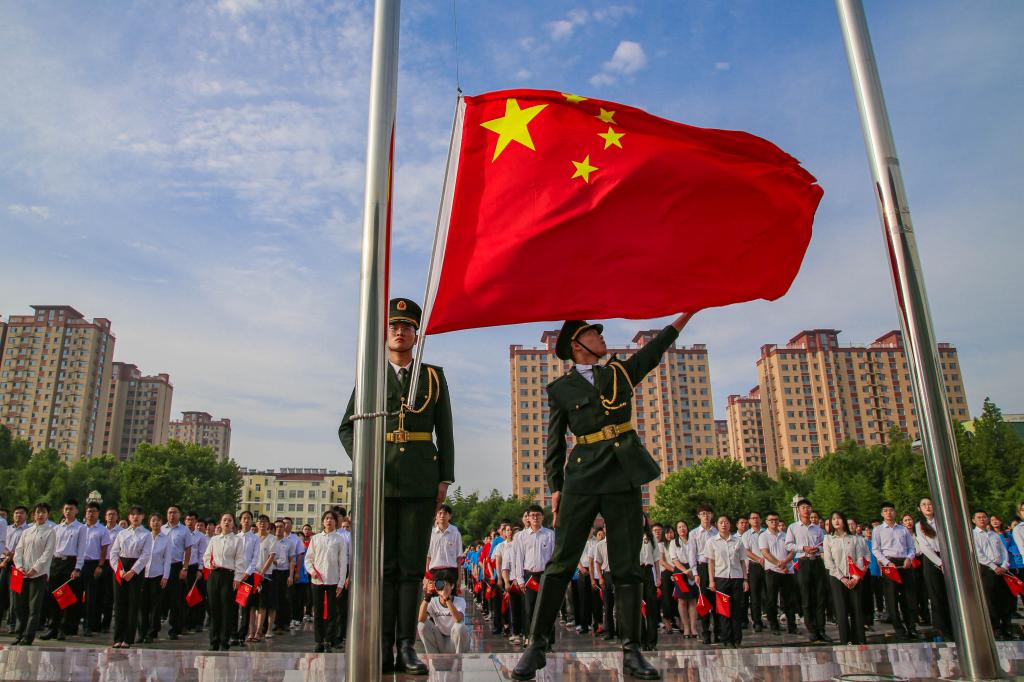 上午7时,临沂校区办公楼前广场,在铿锵有力、整齐划一的脚步声中,鲜艳的五星红旗由校区国旗护卫队护送至升旗台。“升国旗,奏唱国歌。”伴着擎旗手将国旗抛向空中,现场所有人员庄严站立、目光坚定,向五星红旗致以崇高的敬意,伴随着雄壮的国歌声,鲜艳的五星红旗冉冉升起。