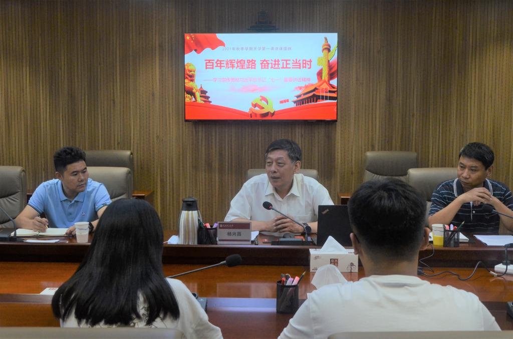 为深入贯彻学习习近平总书记在庆祝中国共产党成立100周年大会上的重要讲话精神,进一步推进365完美体育“三全育人”工作,9月1日下午,党委副书记杨兴昌为其联系的管理工程学院造价194班学生上了一场别开生面的形势政策课暨新学期“开学第一课”。管理工程学院党委书记李洪民,党委副书记、副院长王中帅,班主任李佳妮以及造价194班全体同学参加,活动由李洪民主持。