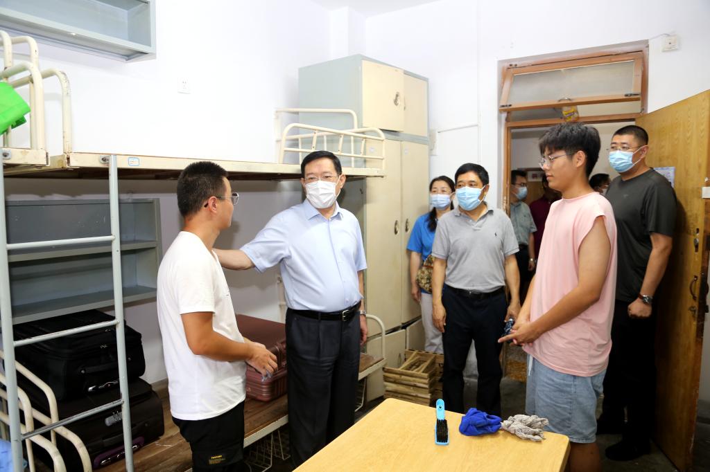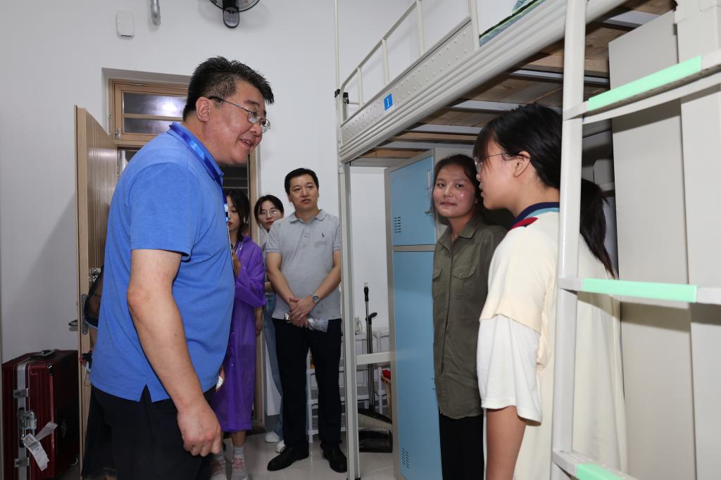 在学生公寓,谭秀森一行询问学生入学后情况,鼓励同学们尽快转变角色,认真做好规划,坚定理想信念,全面提升综合素质,努力做到知行合一、脚踏实地。离开家乡独自生活,要积极培养独立自主能力,强化安全意识和自我保护意识,遇到困难时及时和辅导员、老师们沟通交流,希望大家秉持着“百折不挠、刚毅厚重、勇承重载”的理工精神,好好把握大学阶段的美好时光,度过充实而有意义的大学生涯。