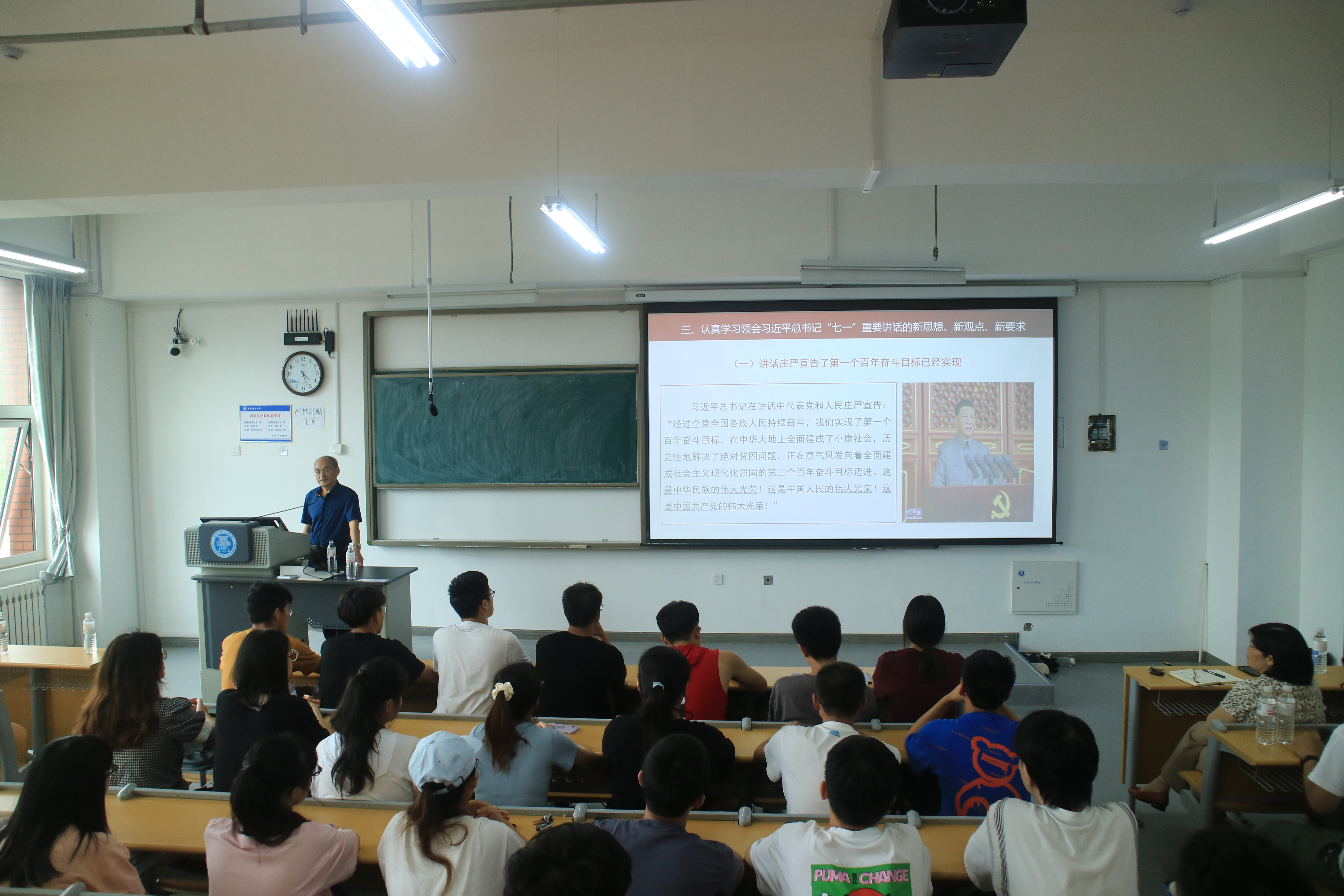 李长河以“百年辉煌路奋进正当时——学习宣传贯彻习近平总书记‘七一’重要讲话精神”为主题,为同学们上了一堂深入浅出的党课。从准确把握习近平总书记“七一”重要讲话的重要意义;认真学习习近平总书记“七一”重要讲话蕴含的百年党史中的数字密码;深刻领会习近平总书记“七一”重要讲话的新思想、新观点、新要求;在学懂弄通做实上下功夫,做勇于担当民族复兴大任的新时代大学生四个方面来讲述新时代大学生应该如何学习贯彻习近平总书记的“七一”重要讲话精神。
