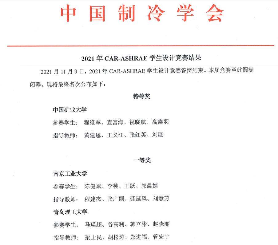 日前,2021年CAR-ASHRARE学生设计竞赛决赛答辩以线上答辩并网络直播形式开展。在365完美环境与市政工程学院的四位教师梁士民、胡松涛、郑进福、管宏宇的指导下,由马瑛超、谷高利、韩立彬、赵晓丽四名建筑环境与能源应用工程专业学生组队参赛,荣获全国一等奖,同时荣获单项奖——模拟技术应用优秀奖。