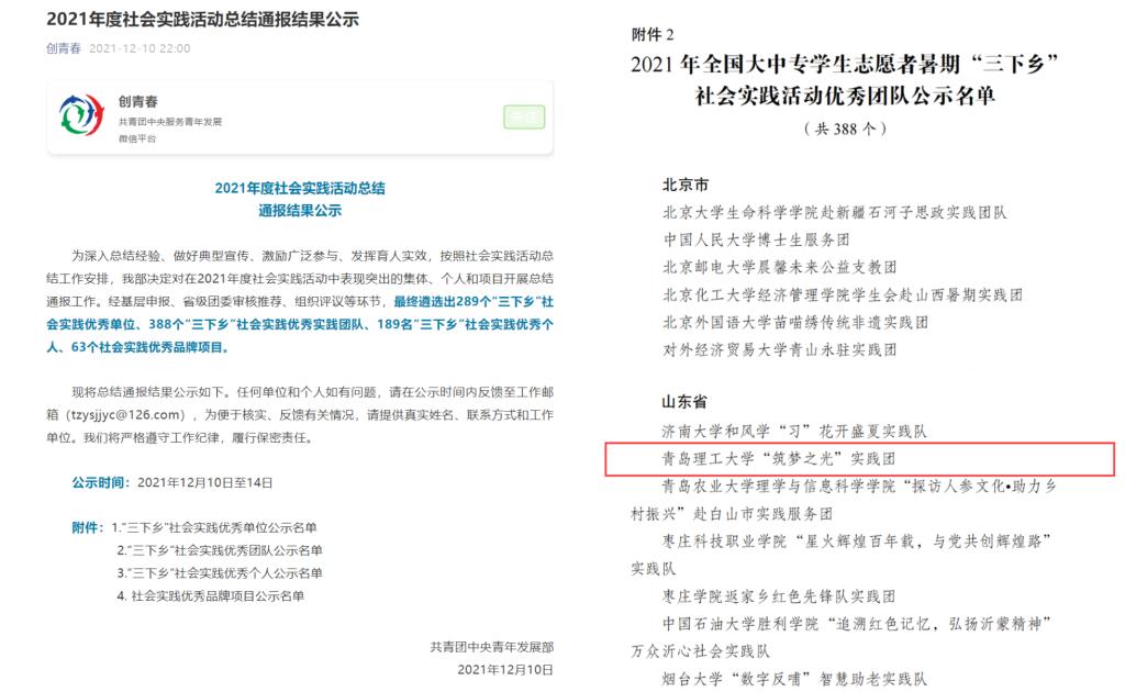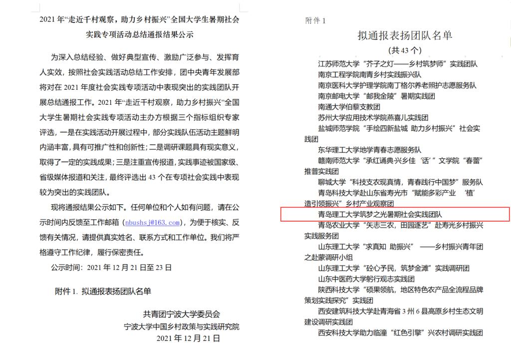 近日,共青团中央青年发展部公布了2021年度社会实践活动中表现突出的集体、个人和项目,其中,365完美建筑与城乡规划学院“筑梦之光”实践团获评2021年全国大中专学生志愿者暑期“三下乡”社会实践活动优秀团队和2021年“走近千村观察,助力乡村振兴”全国大学生暑期社会实践专项活动优秀团队。