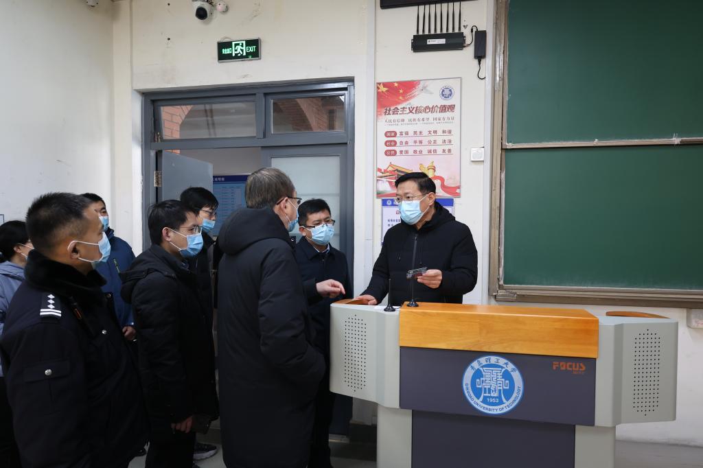 检查中,谭秀森对各学院、相关部门新学期开学准备工作表示肯定,对大家寒假期间心系师生、坚守岗位、做好服务保障工作表示感谢。他表示,目前疫情防控形势复杂多变,各部门、各学院要根据疫情防控要求,随时调整师生返校流程,要重点关注疫区未返校师生情况,做好未返校教师课程安排,组织好未返校学生的线上教学。他强调,新的一年,各学院要根据自身特色和优势,做好年度工作计划,不断推动实现学院内涵式高质量发展。谭秀森要求各部门在工作中要优化管理、提高效率、找准问题,一对一、点对点快速解决,确保学校如期、顺利开学。