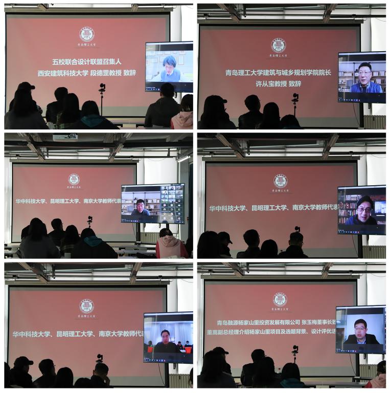 该活动是由多所高校轮流承办的校际教学交流项目,今年已是第八次举办,并由以前的四校联合升成了五校联合。本次毕业设计以“青岛市红色教育基地杨家山里”为题,旨在探讨文旅产业能否带动乡村振兴,如何带动乡村振兴。党委常委、副校长王在泉,中国城市规划协会乡村规划与建设委员会副主任兼秘书长、同济大学教授栾峰,中国城市规划协会乡村规划与建设委员会副主任、西安建筑科技大学教授段德罡,五校指导教师20余人,优秀学子60余人以线上或线下的方式参加了此次开题仪式。会议由建筑与城乡规划学院副院长解旭东主持。