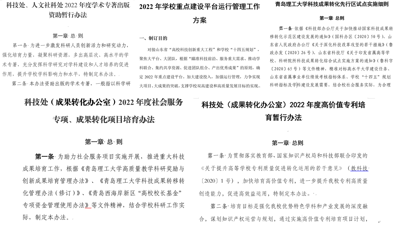 围绕学校全年科研任务,主动对接省“高校科技创新重大工程”,特别是大项目、大平台、大成果,精准谋划,强化政策赋能。联合组建成立专项工作专班,在持续深入调研的基础上,综合施策,谋划了科技成果转化先行区试点管理办法、重点建设平台实施工作方案、高价值专利培育办法、学术专著资助办法、学术会议资助办法、成果转化与社会服务项目实施细则、重大科研项目与成果等一系列科研引导政策,营造良好科研生态,努力激发创新活力,积极推进学校科研水平提升。目前,相关政策措施正在逐步完善和征求意见过程中。