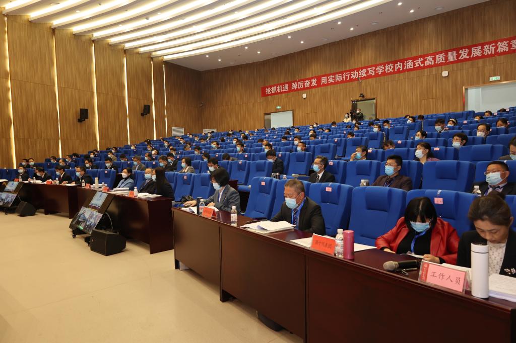 大会在雄壮的国歌声中隆重开幕。在大会第一次全体会议上,党委副书记、校长谭秀森同志作题为《抢抓机遇 踔厉奋发 用实际行动续写学校内涵式高质量发展新篇章》的学校工作报告。报告从党建与思想引领工程、治理体系建构工程、高水平人才培养体系建设工程、一流学科建设工程、科技创新标杆工程、“礼贤学者”引育工程、开放与合作提升工程、大学文化培育工程、校园精益化管理工程、“幸福理工”建设工程十个方面对学校2021年的工作进行了全面总结与分析。一年来,学校党委团结带领全校师生员工,以习近平新时代中国特色社会主义思想为指导,立足新发展阶段、贯彻新发展理念、构建新发展格局,抓住主校区战略转移和实现高质量发展两大任务,统筹推进疫情防控和学校事业发展,学校内涵式高质量发展取得新成效,各项事业呈现良好发展局面,实现了“十四五”的良好开局。