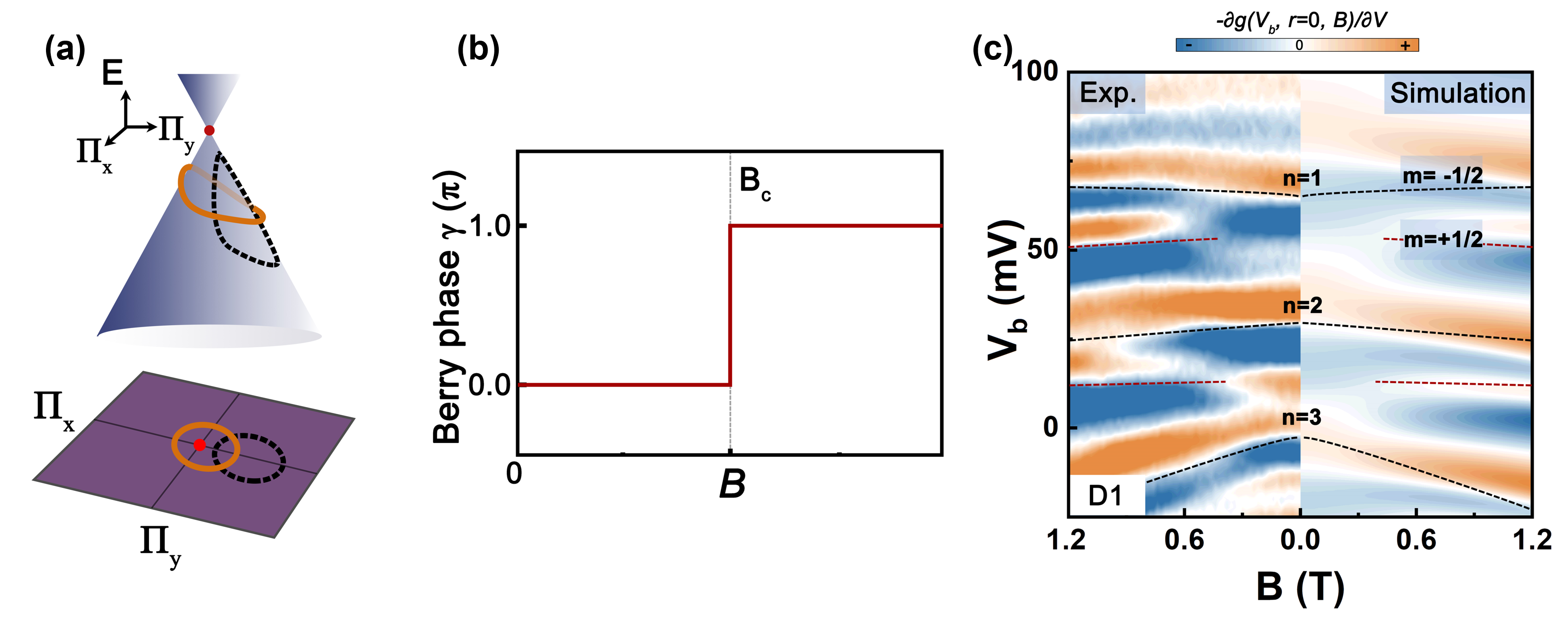 图1.(a)单层石墨烯量子点动量空间电荷轨迹示意图;(b)单层石墨烯量子点贝里相位随磁场的演化;(c)单层石墨烯量子点微分电导在磁场下的演化。
