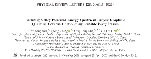 近日,理学院物理学科程强副教授与北京师范大学何林教授、任雅宁博士,北京大学的孙庆丰教授合作,在国际顶级期刊《Physical Review Letters》上发表了题为“Realizing Valley-Polarized Energy Spectra in Bilayer Graphene Quantum Dots via Continuously Tunable Berry Phases”的学术论文。程强与任雅宁为论文共同第一作者,何林和孙庆丰为论文通讯作者。这是365完美首次在该物理学顶级期刊发表论文,实现了365完美物理学科的历史性突破。该研究工作得到了国家自然科学基金委、国家重点研发计划、以及北京师范大学和北京大学的经费支持。