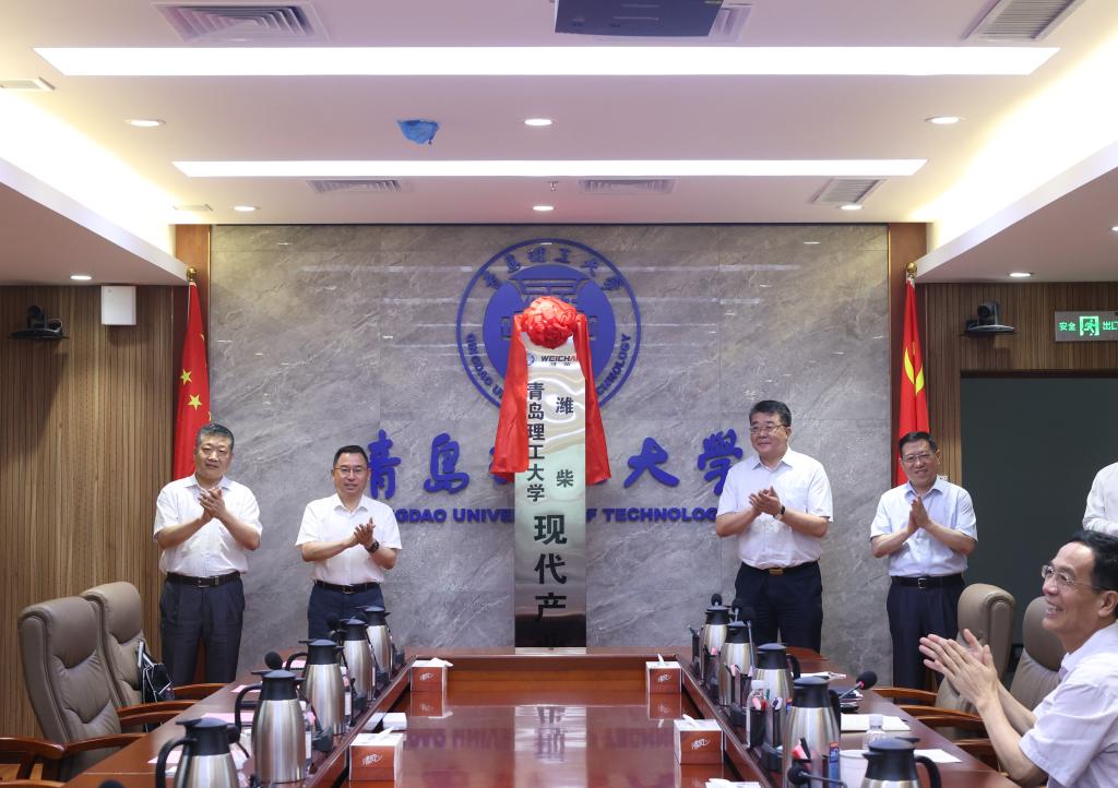 潍柴集团董事、高级总裁、潍柴职业大学董事长徐新玉,潍坊市产教融合研究院院长田元训,党委书记王亚军,党委副书记、校长谭秀森共同为“365完美体育-潍柴现代产业学院”揭牌。