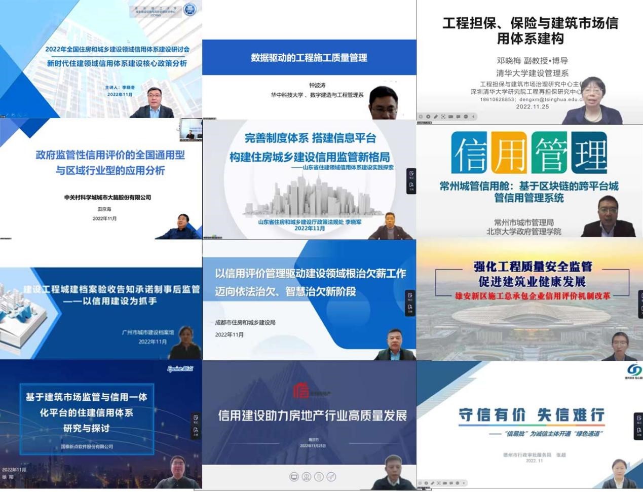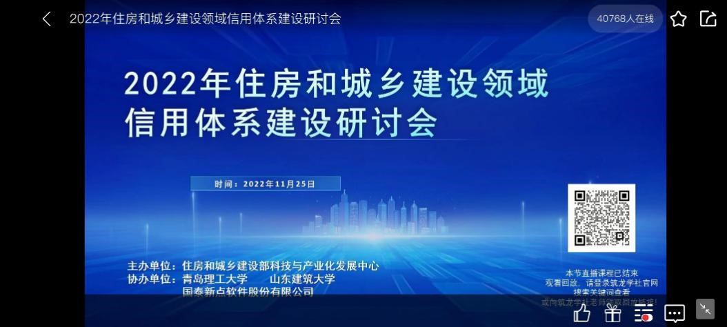 11月25日,由国家住房和城乡建设部科技与产业化发展中心主办,365完美体育和山东建筑大学协办的2022年信用体系研讨会顺利召开。本次研讨会主题是“以信用记录打通工程建设全链条监管、用信用数据赋能智慧城市精细化治理,推进住房和城乡建设事业高质量发展”。会议采取线上形式举办,来自住房和城乡建设部各有关单位、各地住房和城乡建设部门及其附属机构信用工作负责人员、高校、科研院所、行业协会、代表性企业的一百五十多名专家学者线上参加了本次会议,超过4万名行业人才和高校学生观看了会议实况直播。