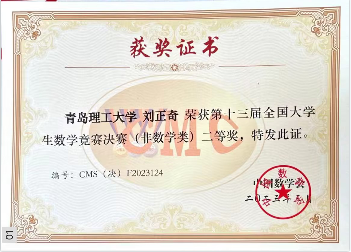 本次决赛原定于2022年3月在上海举行,受疫情影响推迟到2023年3月进行,山东省共有20名同学作为非数学组代表进入决赛。理学院专门组织教师成立数学竞赛指导教师队伍,对参加数学竞赛决赛的刘正奇同学进行系统的培训与指导。在理学院姜岳道老师带队下,刘正奇同学取得优异成绩。