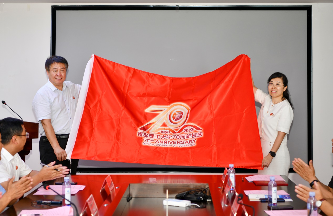 会上还举行了学校70周年校庆“70人70站”校庆旗传递(临沂站)授旗仪式。