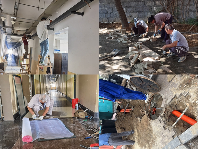 宿舍内,能源与维修服务中心坚持狠抓质量、加强监督,在学生宿舍安装空调配电改造工程中,奔走工程一线,及时掌握和推进施工进度,积极主动做好协调配合,推进高压增容和低压配电改造工程同步展开实施,用辛勤和汗水,推进宿舍条件改善。坚持紧盯进度,顺利完成两校区千余间新生宿舍家具设施的全面维修、室内外墙面修补粉刷以及嘉陵江路校区西运动场围网维修等工作,用责任和担当,确保学习生活场所安全便利。