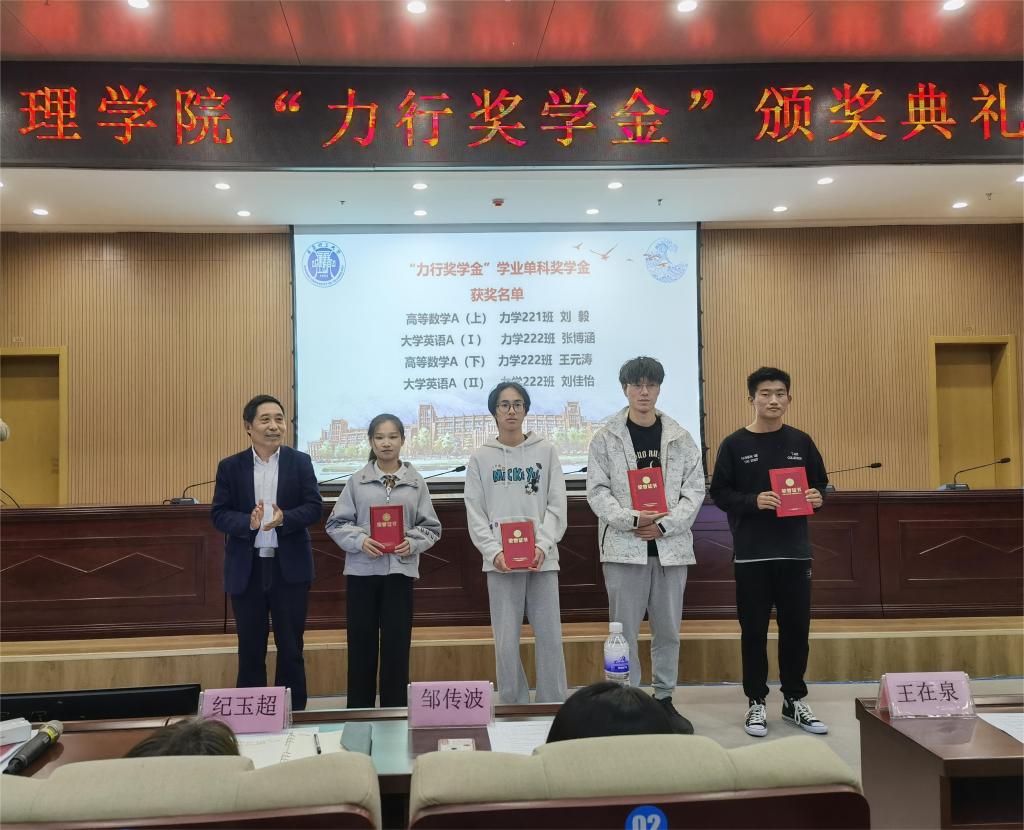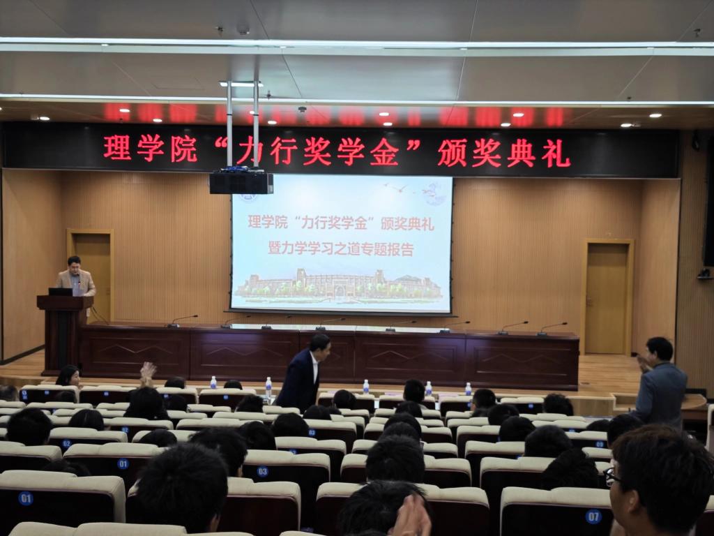 为表彰工程力学学科的优秀学子,激励青年学生勤奋学习、全面发展,同时纪念和传承孙可明教授致力工程力学专业建设和发展的愿望,理学院特别设立“力行奖学金”。11月8日下午,学院在黄岛校区举办首批获奖学生颁奖典礼。学校党委常委、副校长、力学学科带头人王在泉,理学院党委书记邹传波、党委副书记、副院长纪玉超以及力学教研室全体教师出席颁奖典礼。理学院党委副书记、院长孔亮主持典礼。