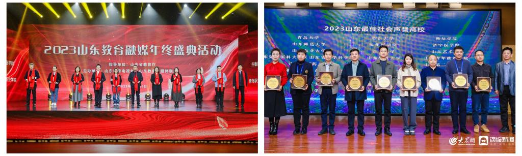 在由山东省教育厅指导、山东广播电视台主办的“红旗云”山东省思政教育服务平台上线仪式暨2024山东教育融媒创新发展恳谈会中,学校荣获“2023年度融媒影响力奖”。在大众网·海报新闻主办的“能量澎湃——因为正能量 澎湃大流量” 2023山东教育品牌发展年会中,学校获评“2023山东最佳社会声誉高校”“2023山东最具影响力教育政务融媒体”;在山东教育电视台(山东教育融媒体联盟)主办的“2023山东教育融媒年终盛典”中,学校荣获“山东教育融媒年度供稿优秀单位”。马馨甜、任衍珍老师获评“大众网·海报新闻2023年度优秀教育融媒体创作人”。石路捷老师获评“2023年度山东广播电视台优秀融媒通讯员”。王云霞老师获评2023年度“山东教育发布”App“先进个人”;作品《带着青春的收获和成长,一起走进一场为名“毕业”的典礼》获短视频单元教育故事类优秀作品奖。
