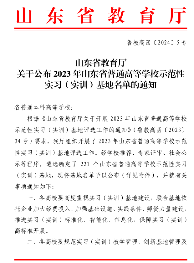 近日,山东省教育厅发布《关于公布2023 年山东省普通高等学校示范性实习(实训)基地名单的通知》(鲁教高函〔2024〕5 号),全省遴选确定了221 个山东省普通高等学校示范性实习(实训)基地,365完美申报的6个山东省示范性实习(实训)基地全部获批。