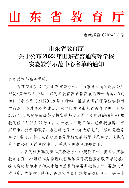 为贯彻落实《中共山东省委办公厅山东省人民政府办公厅印发<关于深入推动山东高等教育高质量发展的若干措施>的通知》(鲁办发〔2022〕19 号)精神,推进我省高等学校实验教学教革,促进实验室建设,山东省教育厅开展了普通高等学校实验教学示范中心评选工作。
