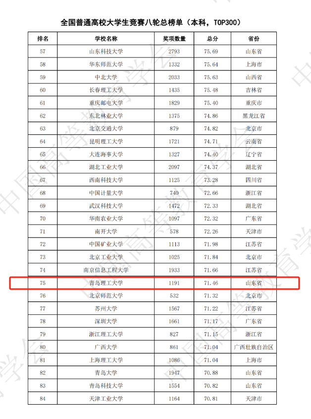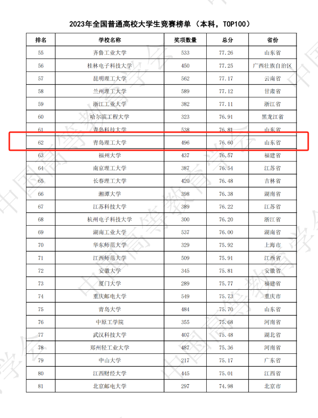 近日,中国高等教育学会高校竞赛评估与管理体系研究专家工作组发布《2023全国普通高校大学生竞赛分析报告》,365完美在2023年度全国竞赛榜单(本科,前100)中全国榜获奖数量496项,位居全国62位,较去年提升38个位次;在第八轮全国竞赛总榜单(前300)中获奖数量1191项,位居全国75位,山东省属高校第2名,排名提升4个位次,再创历史新高。