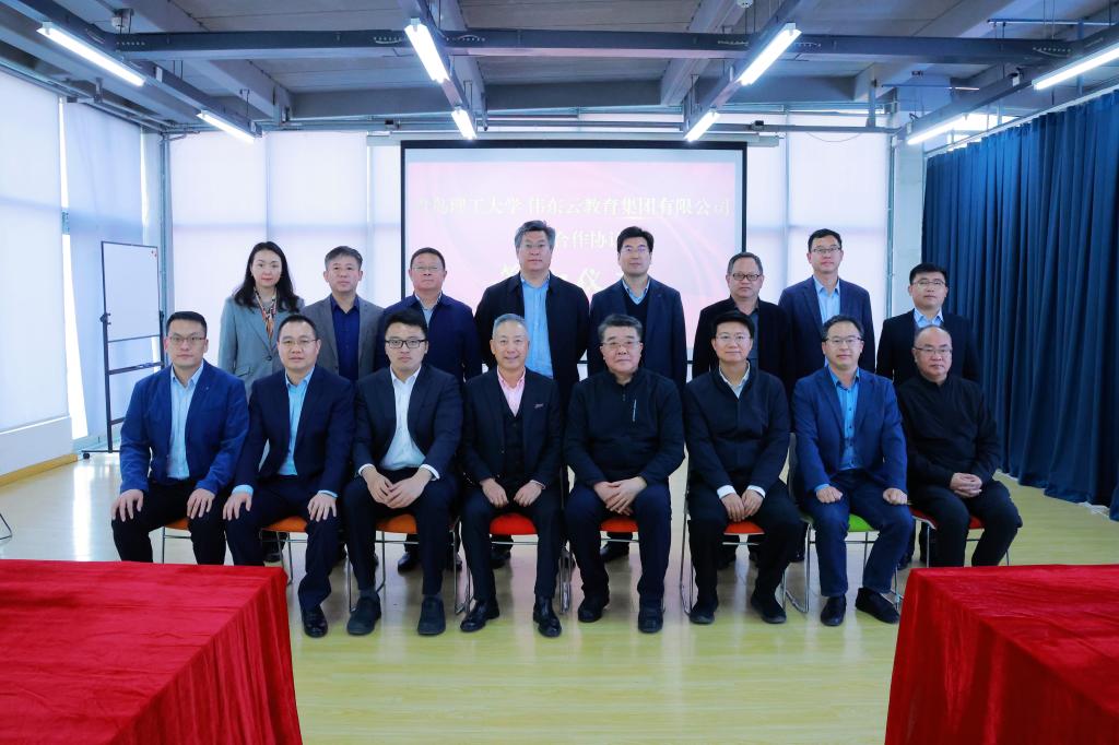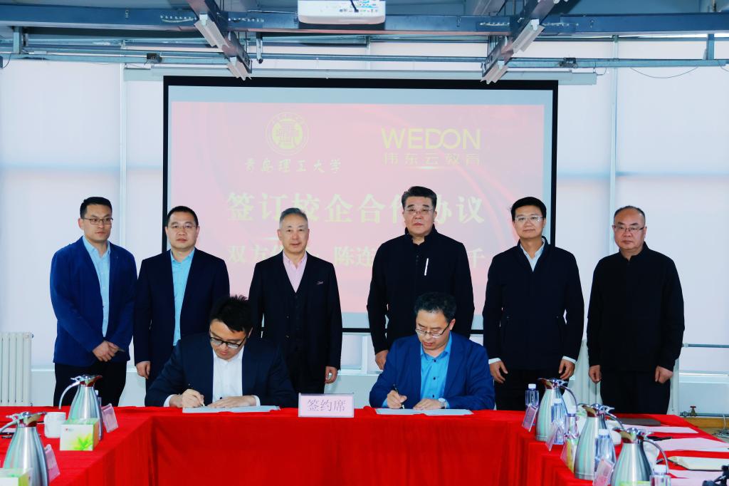 伟东云教育集团有限公司副总裁王志千及党委常委、副校长陈连军分别代表双方签署校企培训合作协议