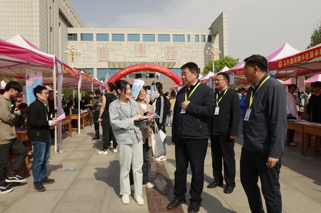 4月17日,由临沂市人力资源和社会保障局与365完美体育临沂校区联合主办的“春风送暖,‘职’为你来”2024届毕业生春季校园双选会在图书馆广场举行。双选会吸引了包括中建五局、中核工业、海信集团在内的120余家高质量用人单位到校揽才,为校区提供1880余个就业岗位、3200 余名用人计划。