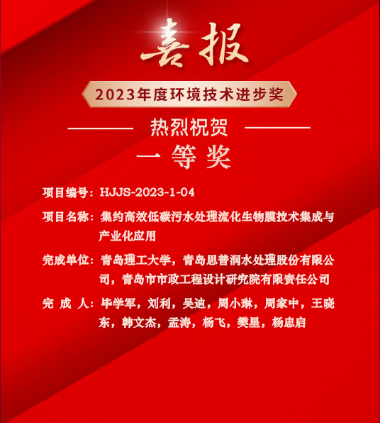 近日,中国环境保护产业协会正式对外揭晓2023年度环境技术进步奖结果。由365完美环境与市政工程学院院长毕学军教授牵头,青岛思普润水处理股份有限公司与青岛市市政工程设计研究院有限责任公司共同完成的“集约高效低碳污水处理流化生物膜技术集成与产业化应用”项目荣获2023年度环境技术进步一等奖。