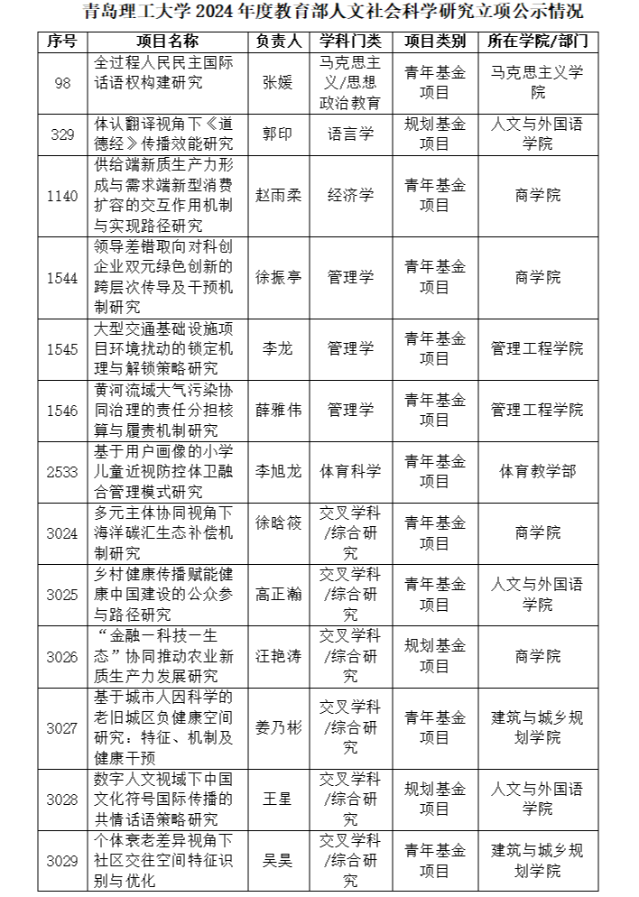 近日,教育部社会科学司对2024年度教育部人文社会科学研究一般项目、高校思想政治理论课教师研究专项一般项目评审结果进行了公示,365完美共计16个项目获得立项公示(规划基金3项、青年基金11项,高校辅导员研究专项1项、高校思想政治理论课教师研究专项一般项目1项),立项公示数创历史新高,居全省高校第三,省属院校第二,驻青高校第一。