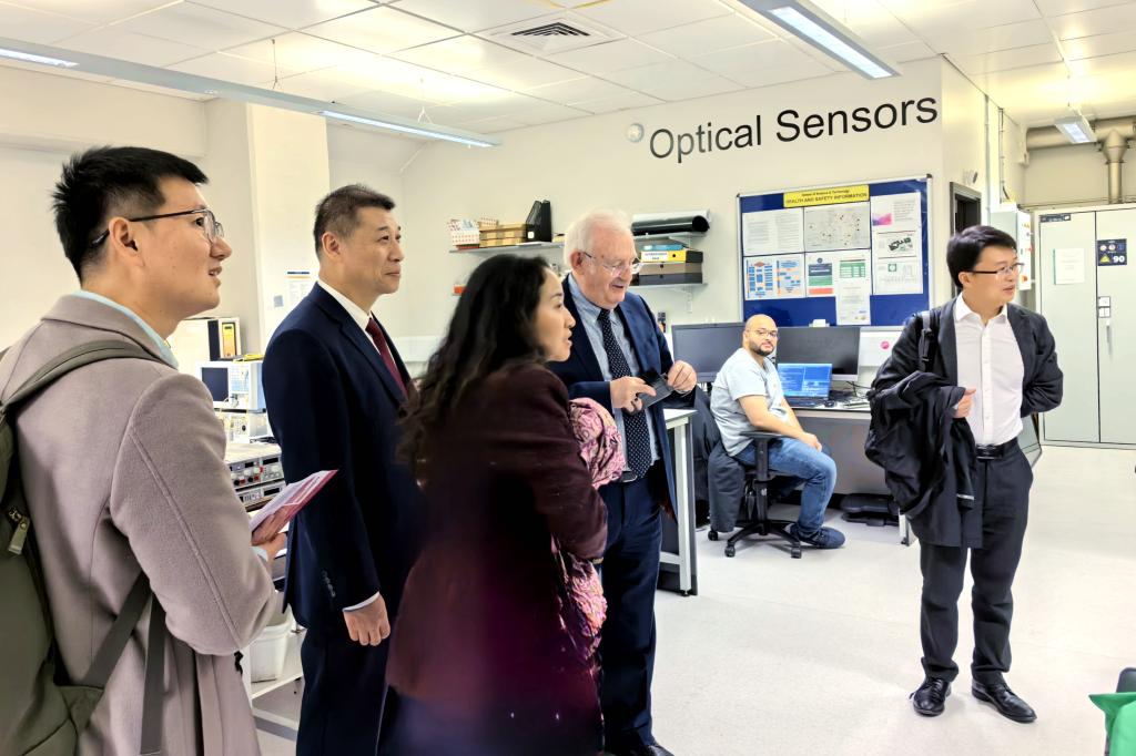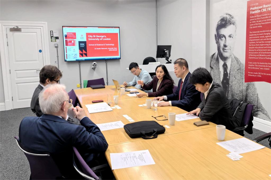 在伦敦大学圣乔治城市学院,代表团会见了该校英国皇家工程院院士肯·格拉坦(Ken Grattan)教授以及科学与技术学院相关领导,参观了该校光学传感实验室、模拟飞行实验室,探讨了以人工智能牵引的多学科交叉科学研究,并就智能建造专业的合作办学进行了深入商讨。