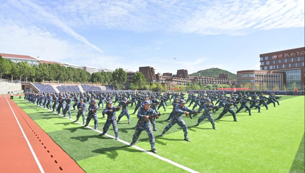 军训汇报演出环节,各学院方阵依次通过主席台接受检阅,同学们步伐铿锵、口号响亮,尽显青春英姿与蓬勃朝气。随后进行的军事技能展示中,6300余名新生以整齐的队列依次完成军体拳、刺杀操、警棍盾牌术、匕首操、旗语操及综合战术演练等多项科目,整个汇演过程节奏紧凑、气势恢宏,展现出青岛理工学子昂扬的精神风貌。