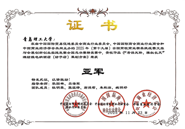 本次获奖项目聚焦潍坊维也纳酒店(坊子店),以“鸢语风聆,雅叙长天”为主题,深挖潍坊风筝等在地文化。团队师生通过问卷调研、实地访谈摸清市场与酒店困境,将维也纳品牌典雅与本地非遗融合,创新性打造了主题客房“鸢都灵”核心IP形象、“潍小厨”特色餐饮等服务;同时,联动风筝节、七夕等节日,结合新青年音乐节等热点做营销,搭配四季活动与IP衍生产品,以“三维价值杠杆”升级盈利模式,助力酒店破解淡旺季失衡等问题,打造了中高端文化体验标杆。凭借项目策划案的突出亮点和竞争优势,团队成员在山东省赛、全国总决赛分组赛、全国总决赛精英赛等多轮角逐中披荆斩棘,从近千支高校队伍中脱颖而出,荣获酒店项目策划赛道全国亚军。