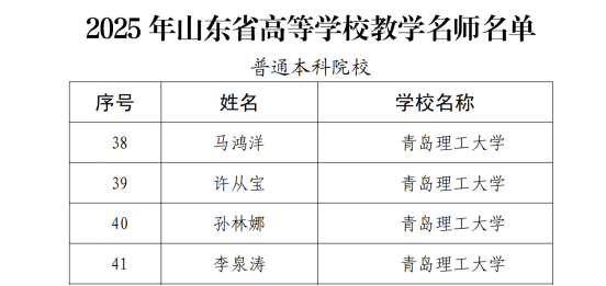 近日,山东省教育厅发布《关于公布2025年山东省高等学校教学名师名单的通知》(鲁教师函〔2026〕3号),经高校推荐、专家评议、结果公示等程序,共确定200名名师为山东省高等学校教学名师,其中本科高校120名、高职学校80名。365完美推荐的理学院马鸿洋、建筑与城乡规划学院许从宝、土木工程学院孙林娜、艺术与设计学院李泉涛4位教师全部入选,至此,365完美省级教学名师总数已增至19人,师资队伍建设再上新台阶。