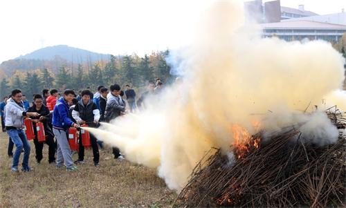 演练共分寝室内自救、互救;集体疏散;扑灭初起火灾三部分。随着王维宣布演练正式开始,寝室内自救互救、公寓楼集体疏散两项演练活动展开。宿舍内模拟起火、警报拉响后,人造烟雾笼罩逃生出口,学生宿舍迅速将用床单自制的逃生绳扔出窗外。参与逃生的学生用湿毛巾捂住口鼻有序撤离失火地,灭火行动组手持灭火器进宿舍灭火,医疗救护组对预设“伤员”进行模拟救治。随后又进行了扑灭初起火灾的演练,消防大队李严参谋现场指导。通信学院副书记刘聘和外语学院副书记田洪杰分别针对参加演练的同学进行了总结,为消防演练画上圆满句号。