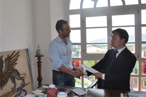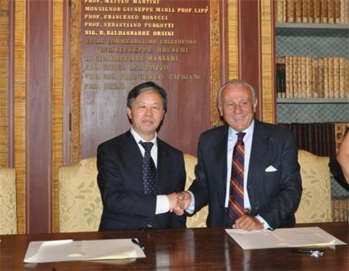 访问意大利佩鲁贾大学期间,薛允洲受到了校长弗兰克·莫里考尼的热情欢迎。在该校富有传统悠久历史的博士厅,薛允洲详细了解了佩鲁贾大学的专业设置和发展状况,就两校进行专业学术交流与互访、学生交流、开展国际合作办学项目等问题进行深入探讨。会谈后,薛允洲、弗兰克·莫里考尼代表两校签署了校际合作协议。