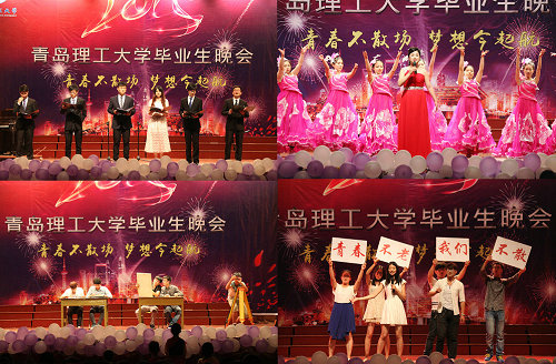 黄岛校区晚会在动感激情的舞蹈《最炫小苹果》中拉开序幕。短剧《青春万岁》展现了当代大学生的责任担当意识和积极进取精神,诗朗诵《逐梦理工》表达了毕业生对母校的深情依恋和美好祝愿,歌曲《以青春之名》唱响了大学生勇敢挑战、努力拼搏的青春之歌,校健美操队热情奔放的《爵士啦啦》彰显了理工女生的青春魅力,满怀深情的歌曲联唱《北风吹过的夏天》、《蓝莲花》、《父亲》,优美动听的男女二重唱《映山红》,诙谐幽默的相声《文人墨客》,美妙奇特的阿卡贝拉《情非得已》,情景现代舞《再见青春》及柔美的古典舞《风酥雨忆》将晚会一次次推向高潮。