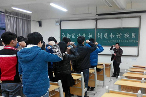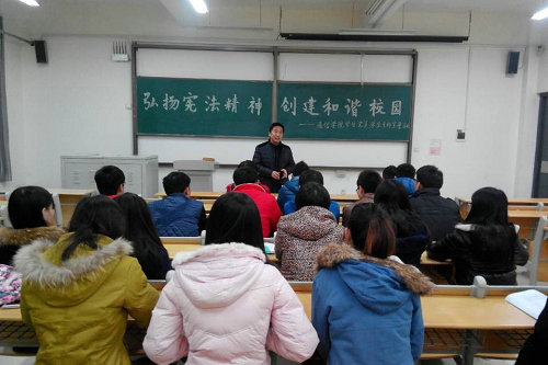 经贸学院的同学在团总支老师的带领下,不顾严寒,在二教和食堂门口开展“普及法律知识,构建和谐校园”活动。他们自己制作法制宣传海报,重点对宪法知识进行宣传,并向同学们发放了普法宣传彩页和法制宣传环保袋;还在在全校范围开展“深入学习宪法,弘扬法治精神”的大型签名活动。该学院团总支书记王振介绍,学院将组织师生进行后续跟踪法律知识调查,确保学法、知法、守法、用法的观念深入广大师生,学会运用法律的武器维护自己的合法权益。