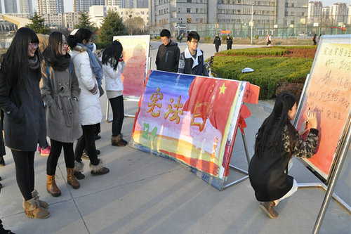 在采访中同学们表示,在我国第一个“国家宪法日”,宣传宪法精神,培养法制观念,是当代大学生的义务和责任。只有让大家都懂得宪法精神,才能养成自觉遵守法律、尊重法律的良好行为习惯。商学院财管132班马小雪在接受采访时说:“我对宪法知识了解的并不多,很感谢学校开展这么多可以学到更多宪法知识的活动,希望大家都能从一系列宣传中多学习一些法律知识,逐步树立法制观念,养成守法习惯。”在提及学习宪法对大学生有什么影响时,自动化机电专业132班的张新华说:“宪法日宣传教育活动,有助于师生增强法律意识,有助于我们对其他学科、尤其是法学临近学科知识和理论的了解、把握”。 经贸学院经济132的张颖表示:宪法是国家的根本大法,培养公民遵纪守法的意识和正确的人生观和价值观,利于维护国家的安定团结和社会秩序。(韦子木 高江李晓辉王振 祁文茹)