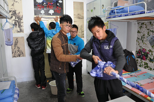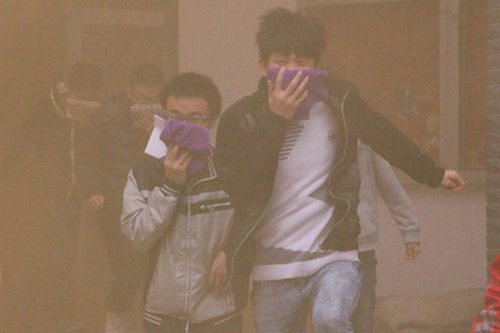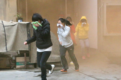 嘉陵江路演练现场,李东宣布演练正式开始。寝室内自救互救、公寓楼集体疏散两项演练活动分别在嘉陵江路校区7公寓,长江路校区ABC学生公寓展开。宿舍内模拟起火、警报拉响后,人造烟雾笼罩逃生出口,A区学生公寓2、3层学生宿舍迅速将用床单自制的逃生绳扔出窗外。参与逃生的学生用湿毛巾捂住口鼻有序撤离失火地,灭火行动组手持灭火器进宿舍灭火,医疗救护组对预设“伤员”进行模拟救治。扑灭初起火灾的演练,分别在嘉陵江路校区主教学楼前、长江路校区ABC学生公寓旁空地的指定位置上进行。